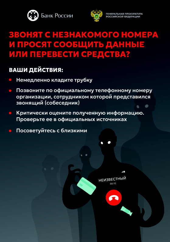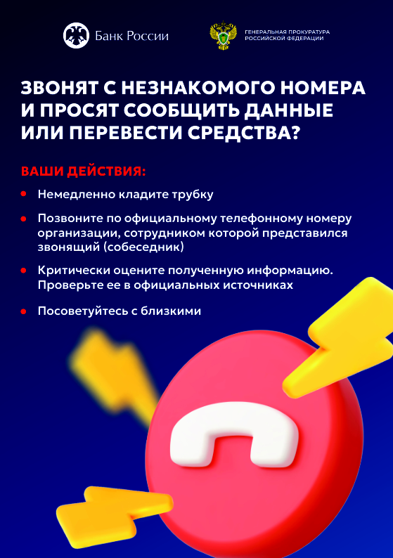 Ввиду возрастания угроз преступных посягательств Генеральной прокуратурой Российской Федерации совместно с Банком России разработаны цифровые плакаты в целях повышения уровня информированности населения о действиях лиц, вводящих в заблуждение в целях хищения денежных средств.