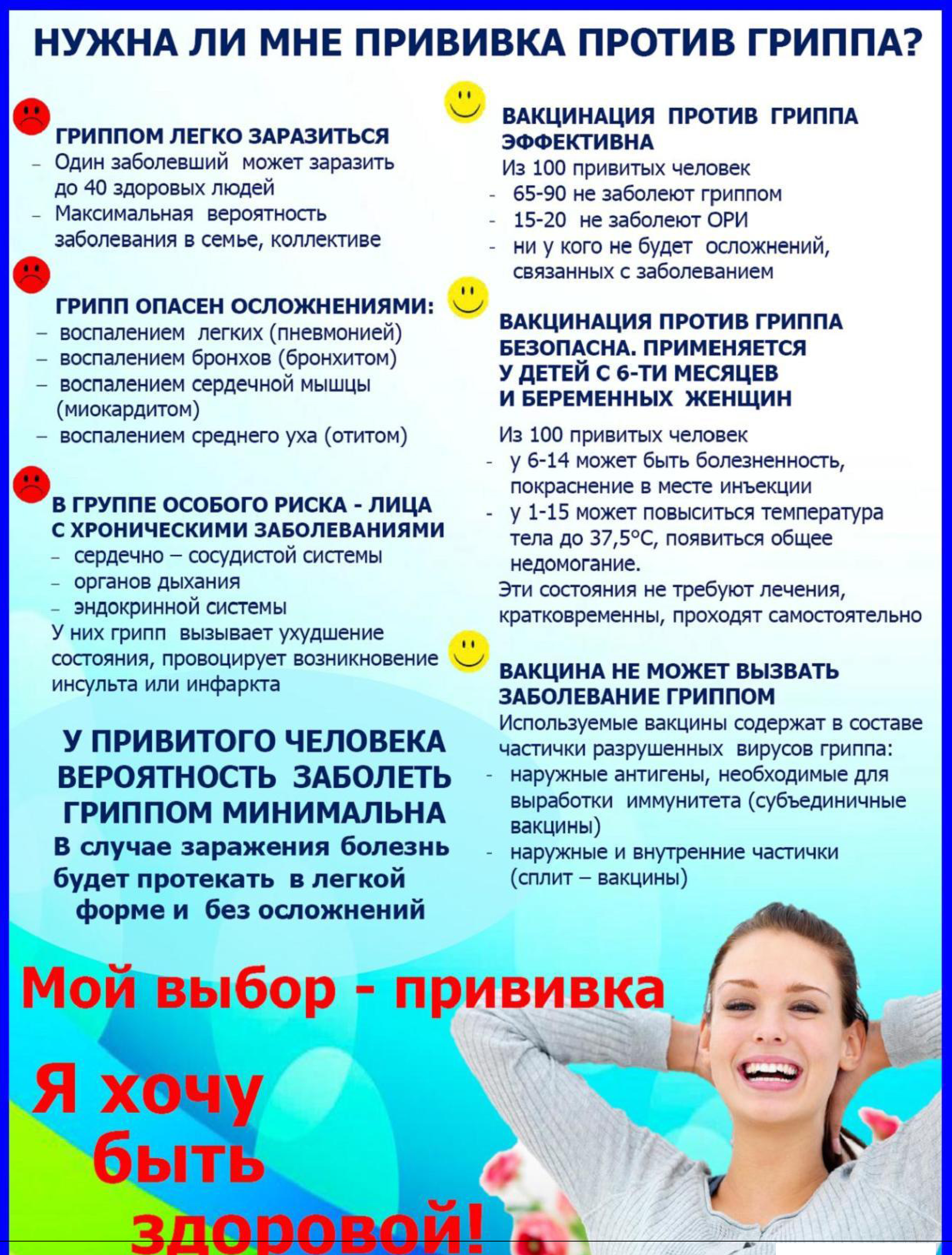 - Прививка не способна вызвать заболевание. В современных вакцинах против гриппа не содержатся вирусы – ни живые, ни мертвые. Основа этих препаратов – лишь частицы вирусной оболочки. Вакцина никоим образом не способна вызвать заболевание, против которого она направлена. В некоторых случаях возможны поствакцинальные реакции, но в основном они несущественны. Грипп с его осложнениями на этом фоне выглядит куда страшнее.