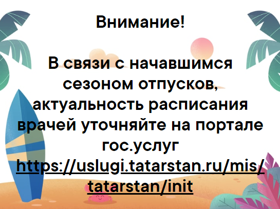 Согласно приказу МЗ РТ №573 от 31.03.2020г. с 02.04.2020г. отменены плановые приёмы до особого распоряжения.