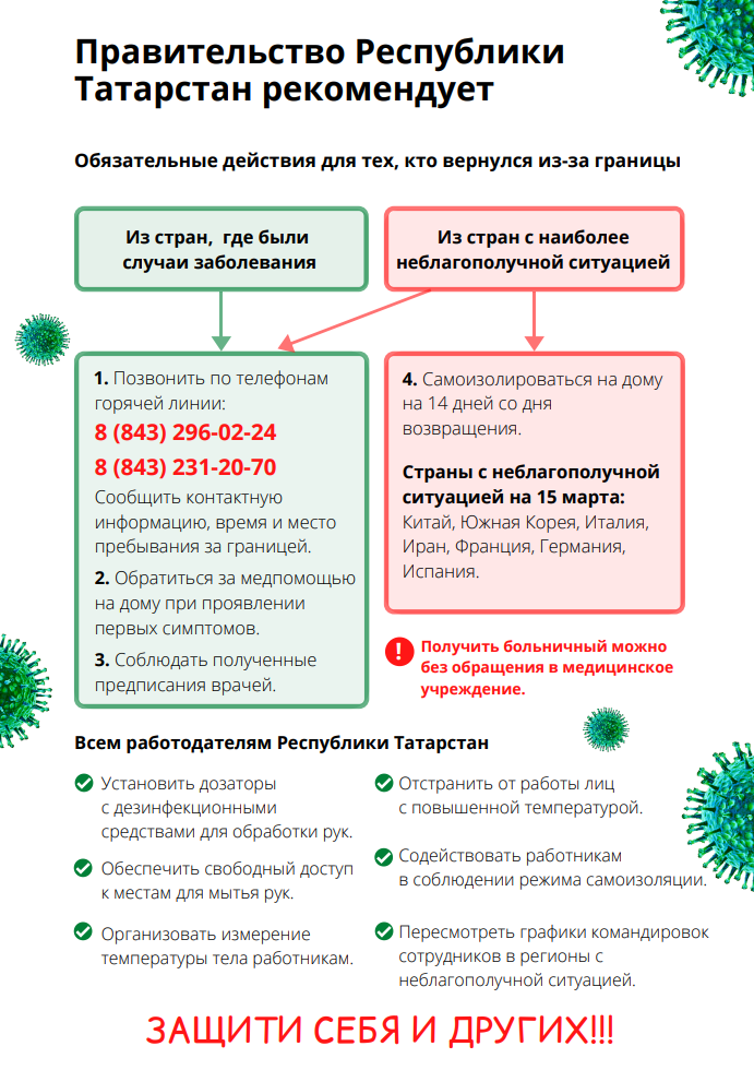 Воздержитесь от поездок в зону риска по распространению вирусной инфекции, в том числе коронавирусной COVID-19.
