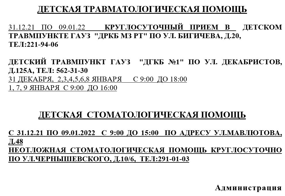 31.12.21 ПО 09.01.22 КРУГЛОСУТОЧНЫЙ ПРИЕМ В ДЕТСКОМ ТРАВМПУНКТЕ гаУЗ "Дркб МЗ РТ" по ул. бигичева, д.20,