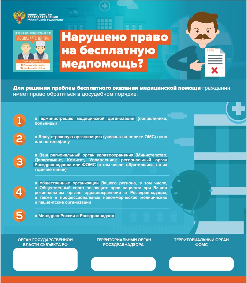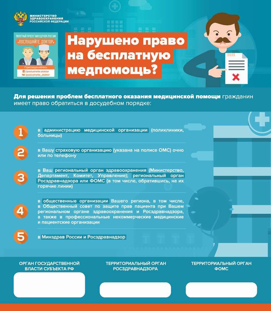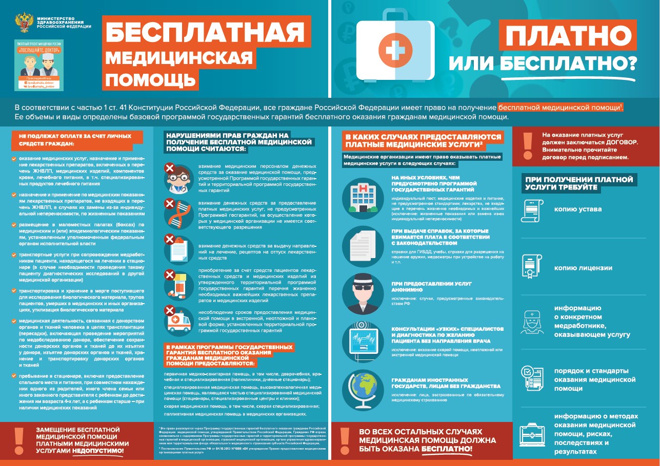 Памятка для граждан о гарантии бесплатного оказания медицинской помощиПамятка Министерства Здравоохранения Российской Федерации для граждан о гарантиях бесплатного оказания медицинской помощи.В соответствии со статьей 41 Конституции Российской Федерации каждый гражданин имеет право на охрану здоровья и бесплатную медицинскую помощь, оказываемую в гарантированном объеме без взимания платы в соответствии с Программой государственных гарантий бесплатного оказания гражданам медицинской помощи (далее — Программа), ежегодно утверждаемой Правительством Российской Федерации ...