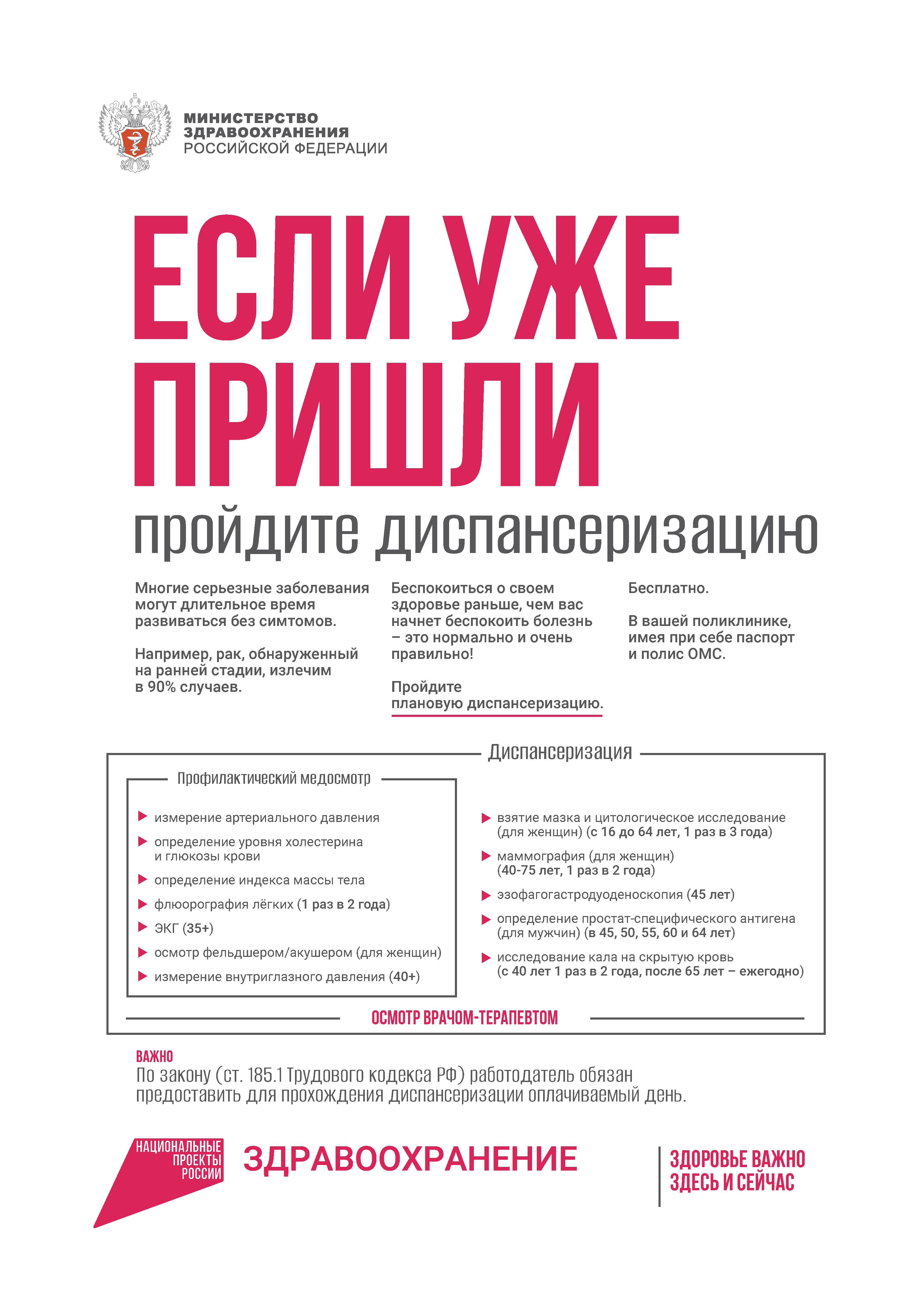 Для прохождения профилактического медицинского осмотра и диспансеризации определенных групп взрослого населения пациенту необходимо обратиться с полисом ОМС в поликлинику ГАУЗ "Черемшанская ЦРБ" к участковому врачу-терапевту (врачу общей практики):
