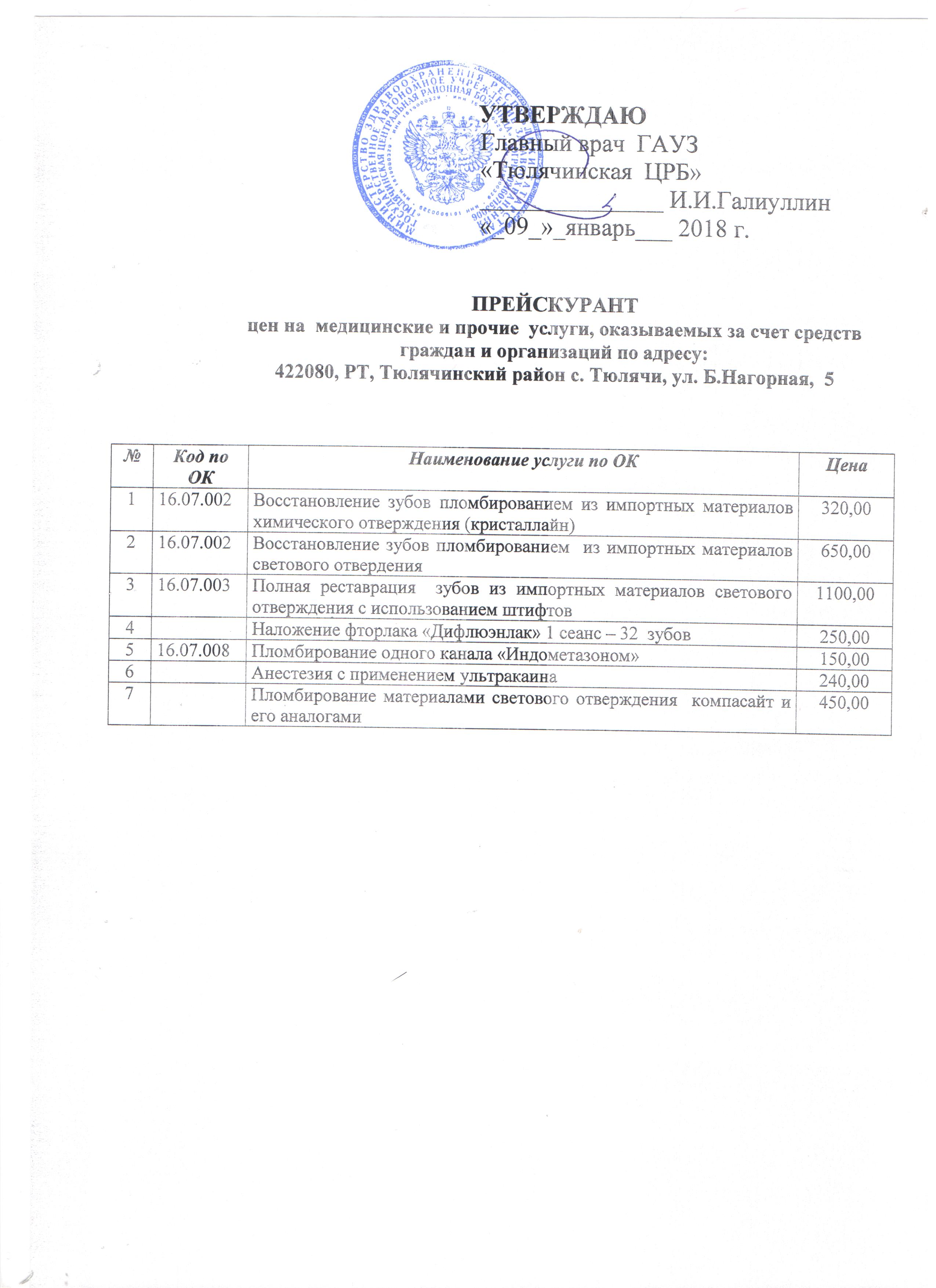 Прейскурант цен на медицинские услуги по Стоматологической поликлинике ГАУЗ "Тюлячинская ЦРБ"