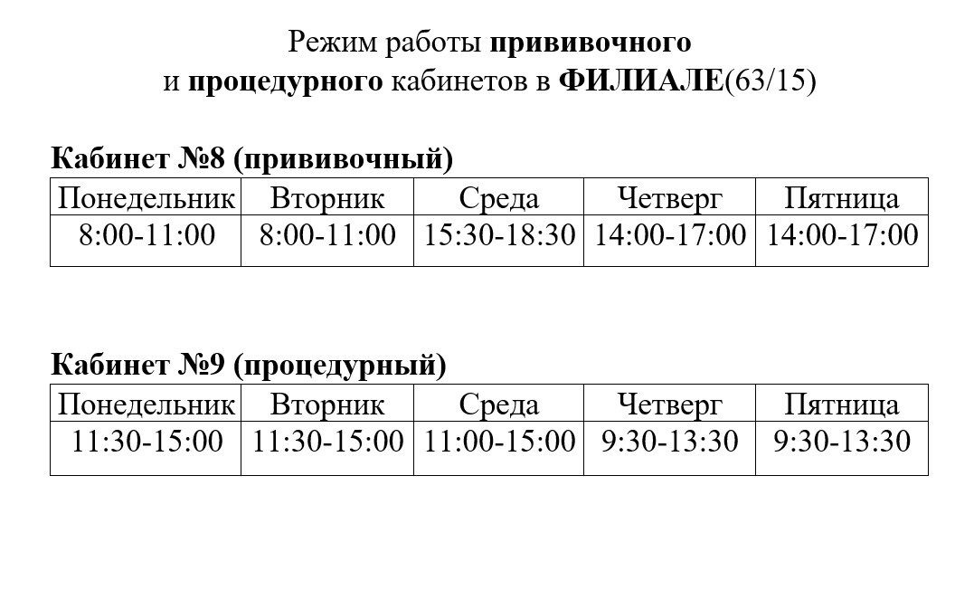 - Работа процедурного кабинета с 9.00 до 14.00 часов.
