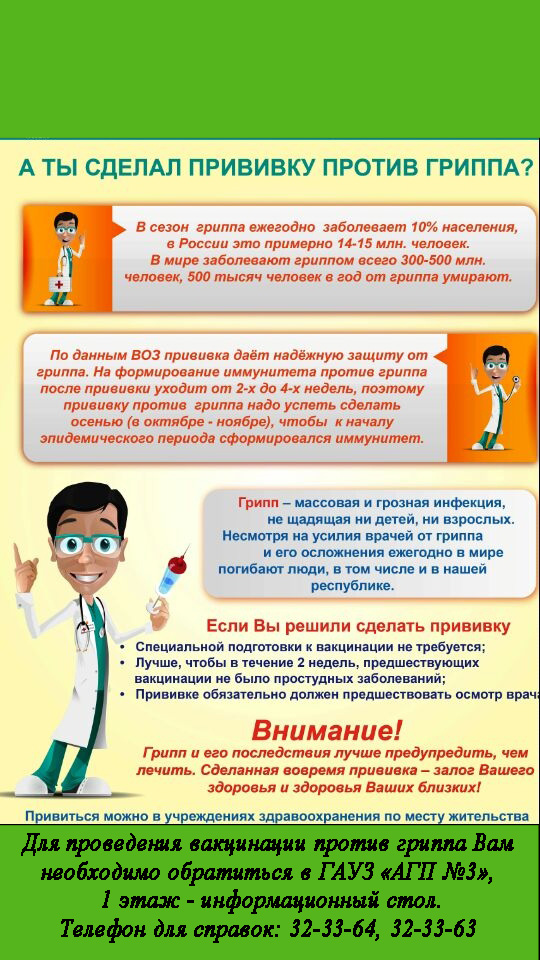 ГАУЗ «Альметьевская ГП №3» проводит плановую вакцинацию взрослого прикрепленного населения в рамках национального календаря профилактических прививок от следующих инфекций: дифтерия, столбняк, корь, вирусный гепатит В, грипп; и в рамках профилактических прививок по эпидемиологическим показаниям: пневмококковая инфекция, менингококковая инфекция, клещевой энцефалит, гепатит А, корь, бешенство.