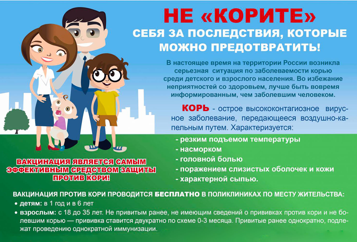 Уважаемые жители, если вы относитесь к категории взрослых от 18 до 35 лет (включительно), не болевшим, не привитым, привитым однократно, не имеющим сведений о прививках против кори и к категории взрослых от 36 до 55 лет (включительно), относящихся к группам риска (работники медицинских и образовательных организаций, организаций торговли, транспорта, коммунальной и социальной сферы; лица, работающие вахтовым методом, и сотрудники гос. контрольных органов в ПП через гос. границу РФ), не болевшим, не привитым, привитым однократно, не имеющих сведений о прививках против кори, вам необходимо подойти в поликлинику по месту прикрепления для иммунизации!