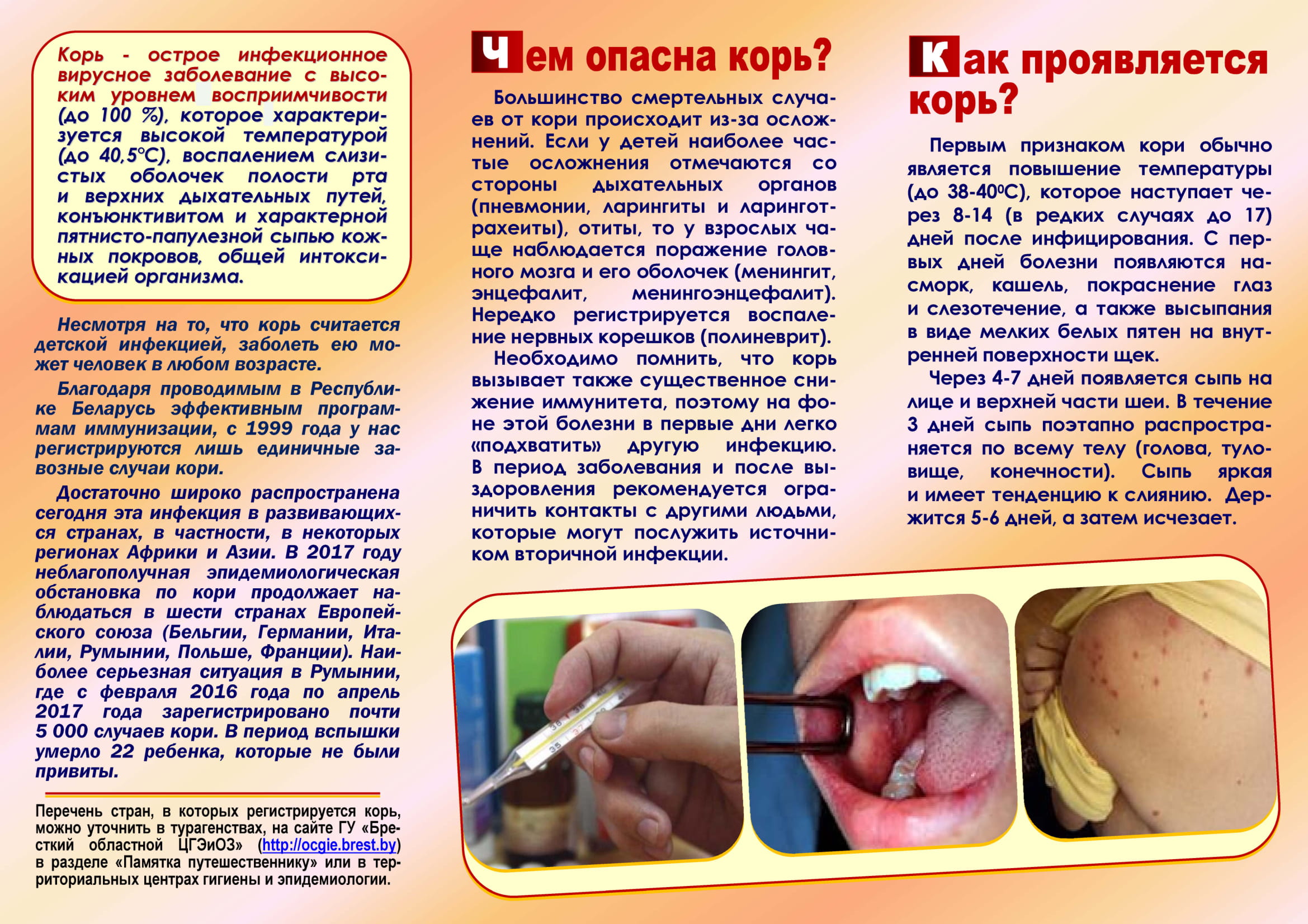 Корь - это острое инфекционное заболевание, которое проявляется температурой выше 39 градусов, сильной интоксикацией, болью в горле, кашлем и характерной сыпью. Болезнь вызывается вирусом, который проникает в организм через слизистую оболочку рта, носа и глаз.