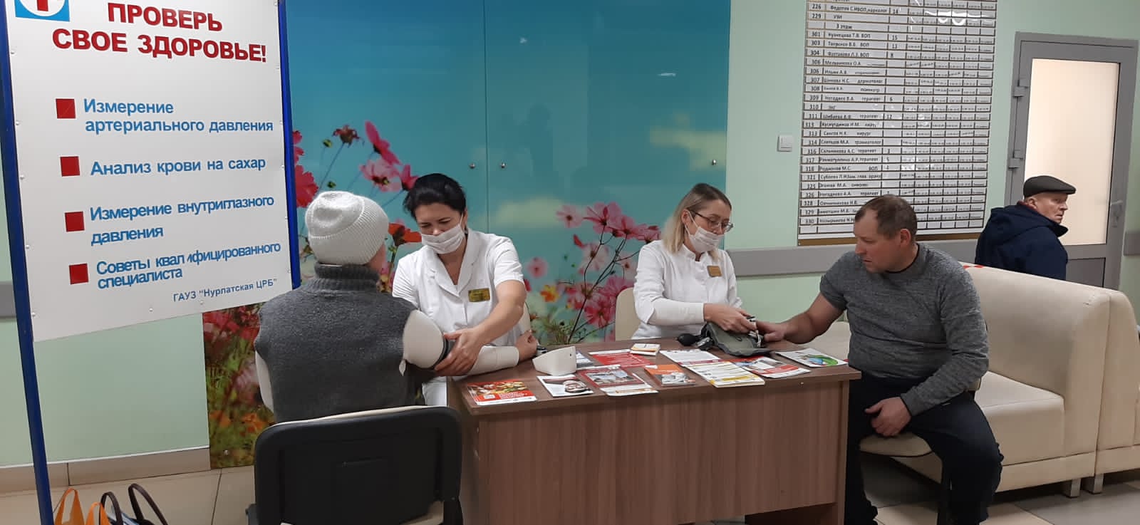 В Нурлатской поликлинике 05.04.2018 г. была организована акция "Проверь свое здоровье". В рамках акции посетители поликлиники смогли измерить артериальное и внутриглазное давление, индекс массы тела, получить информационные брошюры и буклеты по профилактике сердечно-сосудистых заболеваний, здоровому питанию, дневники самоконтроля артериального давления. А для пациентов стационара центральной районной больницы и будущих мам родильного отделения медицинские работники прочитали профилактические лекции по вопросам здорового образа жизни.